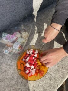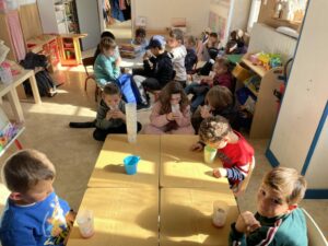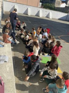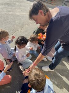 Tous réunis sur la cour, et avec le soleil encore présent, la dégustation peut commencer … Chacun s’exprime sur la texture, l’odeur, le goût des tomates cerises, carottes, radis et du chou-fleur. Quelques grimaces se dessinent, mais dans l’ensemble les enfants se prêtent au jeu.